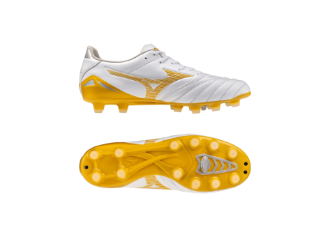 El botín de fútbol Mizuno Morelia Neo IV Pro para césped natural, perteneciente a la colección Bright Gold, está especialmente diseñado para superficies de césped natural duro y está fabricado con cuero de canguro de alta calidad. Los botines cuentan con una suela Zeroglide Lite y una suela exterior plana que proporcionan una sensación natural como si se jugara descalzo y permiten una gran movilidad. El diseño se basa en la filosofía Kaizen, que busca la mejora continua, y continúa la tradición de la línea Morelia original de 1985, modernizándola. El ajuste óptimo y el énfasis en la comodidad ayudan a los jugadores a concentrarse plenamente en el juego. Los tacos estándar y el sistema de cordones clásico garantizan un agarre y una estabilidad seguros en el campo. La combinación de colores blanco, dorado y plateado le confiere al botín un aspecto elegante. En general, este botín ofrece una solución moderna y cómoda para los futbolistas que valoran la calidad, el rendimiento y el estilo.