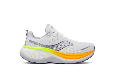 Le Saucony Hurricane 25 est une chaussure de course polyvalente et stabilisante spécialement conçue pour les coureurs en surpronation. Il associe deux types de mousse dans la semelle intermédiaire – PWRRUN PB pour un amorti léger et un retour d'énergie optimal, ainsi que la mousse PWRRUN pour une absorption d'impact durable. La technologie Center Path offre un mouvement de déroulement naturel et confortable grâce à un design de plateforme large, un profil asymétrique et une géométrie de bascule. Le matériau de tige FORMFIT s'adapte parfaitement au pied et offre un maintien sûr et de soutien, particulièrement au niveau de l'avant-pied. La maille technique stratégiquement placée assure flexibilité et ventilation. Une semelle intérieure Super Responsive au niveau du talon ajoute un amorti supplémentaire pour un confort accru. La semelle extérieure en caoutchouc XT-900 robuste garantit une traction durable et une protection contre l'usure. Avec un cadre de guidage TPU stabilisant, la chaussure associe confort, stabilité et performance de course dynamique – idéale pour les longues distances, l'entraînement quotidien, et les coureurs qui souhaitent protéger leurs articulations. Des détails de qualité tels que la langue souple avec finition suédée et les éléments réfléchissants complètent le design. Le Hurricane 25 convient parfaitement aux coureurs exigeants qui privilégient un contrôle doux mais efficace et une sensation de course confortable. La couleur blanche avec des accents orange néon souligne l'aspect moderne et sportif de la chaussure. La marque Saucony représente l'innovation et la qualité supérieure dans la catégorie des chaussures de course stabilisantes.