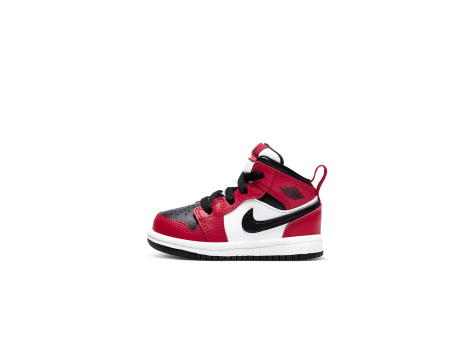 Le NIKE JORDAN Air Mid 1 TD Chicago Toe sono delle scarpe da ginnastica per bambini piccoli, ispirate al design classico e alla combinazione di colori iconica del modello originale. La scarpa presenta una parte superiore in pelle nera nella parte anteriore e dei classici "Swoosh" laterali in pelle nera che si uniscono sul tallone. Dettagli rossi e una base bianca completano il design, mentre una tomaia perforata in nero garantisce la traspirabilità. L'iconico "ala" Air Jordan è presente sul colletto della scarpa. La suola intermedia è bianca, mentre la suola esterna è nera, elementi che insieme sottolineano il look sportivo ma senza tempo della scarpa. Questo modello è stato lanciato il 1° aprile 2020 e offre l'estetica classica di Jordan, appositamente progettata per i piccoli piedi, combinando stile e comfort.