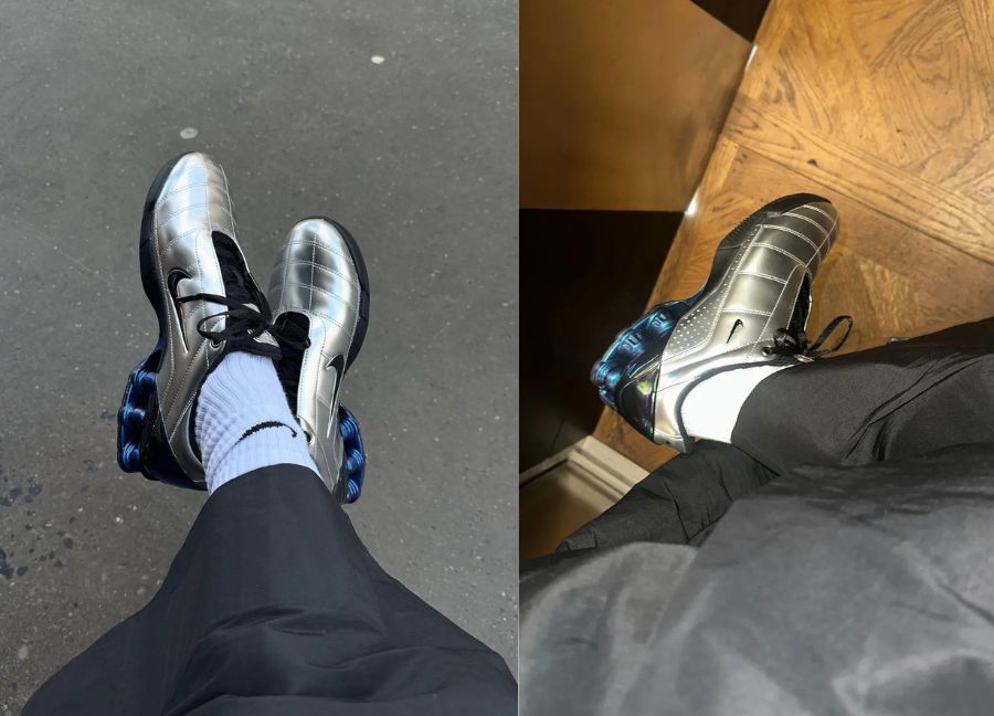 Maha durften sich nicht nur mit einem speziell für diese Collabo designten Logo auf der Zunge und dem Sockliner des Sneakers verewigen, auch bei den Details und Materialien zeigt sich der moderne, feminine Streetwear-Style der Amsterdamer Sneaker-Boutique. Der Mini-Swoosh auf der Außenseite ist so ein besonderes Detail. Ansonsten will die Kombination aus einem schimmernden Lackleder-Upper und dem farblich abgesetzten Fersenstück natürlich auffallen. Hier kommen der früher einmal nicht ganz unumstrittene Shox-Style mit dem Fußball-Trend zusammen.
