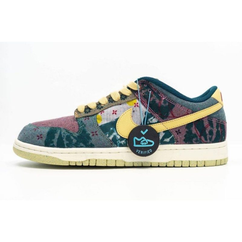 Dabei wurde das namensgebende Zitronen-Gelb eher sparsam eingesetzt. So sind lediglich der Swoosh, die Laces und ein Teil der Ferse gelb gefärbt. Das tut dem äußerst gelungenen Gesamtbild des Nike Dunk Low SP „Lemon Wash“ aber keinen Abbruch. Der Dunk besitzt ein sehr robustes, blau-rotes Canvas-Upper mit verschiedenen Prints, deren Design es noch zu entschlüsseln gilt. Eine Besonderheit zeigt sich bei der Außensohle, für die ähnlich wie beim „Space Hippie“ ganz offenbar Materialreste (Gummi) aus der Produktion genutzt worden sind. Das würde zumindest den besonderen Look der Outsole erklären. Außerdem liegt der Sneaker damit voll im Zeitgeist, der immer mehr auf Nachhaltigkeit achtet. Auch vielen Sneaker-Käufern ist dieses Thema äußerst wichtig, wie der Nachfrage-Boom bei solchen Modellen zeigt.