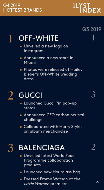 Der Wert der Marke Off-White ist nicht genau zu ermitteln. Im dritten Quartal 2019 lag Off-White laut der Mode-Suchmaschine Lyst zum wiederholten male auf Platz 1 der beliebtesten Fashion-Brands – noch vor Gucci und Balenciaga.
