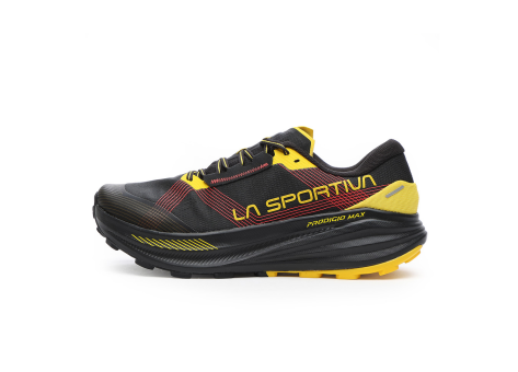 De La Sportiva Prodigio Max is een trailrunningschoen voor heren, speciaal ontworpen voor veeleisend terrein. Met deze schoen kun je moeiteloos uitdagende paden afleggen. Het ontwerp is gericht op comfort en prestaties in de outdooromgeving, met een robuuste zool die zorgt voor goede grip op oneffen ondergrond. De combinatie van zwart en geel, met opvallende accenten, geeft de schoen een dynamisch design. La Sportiva staat bekend om hoogwaardige sportschoenen die functionaliteit en stijl combineren.