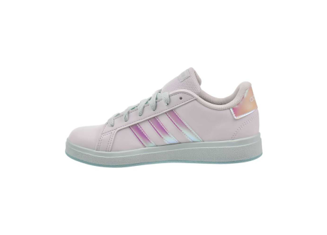 Der adidas Originals Grand Court Sneaker für Kinder präsentiert sich als moderner Klassiker, der neu interpretiert wurde. Der Schuh verfügt über ein weiches, aber widerstandsfähiges Obermaterial aus synthetischen Stoffen, das Stößen gut standhält. Die Gummisohle unterstützt und schützt die wachsenden Füße optimal. Besonders hervorzuheben ist, dass das Obermaterial zu mindestens 50 % aus recycelten Materialien besteht, was den Schuh nachhaltiger macht. Das Design zeigt sich in einer ansprechenden Farbkombination mit Cloud White, Flash Aqua und Halo Mint. Dieser Schnürschuh ist bei Kindern und Eltern gleichermaßen beliebt, denn er vereint Komfort, Schutz und eine umweltbewusste Herstellung in einem zeitlosen Look. Die Adidas-typischen drei Streifen an der Seite sind leicht irisierend und verleihen dem Schuh einen modernen Akzent.