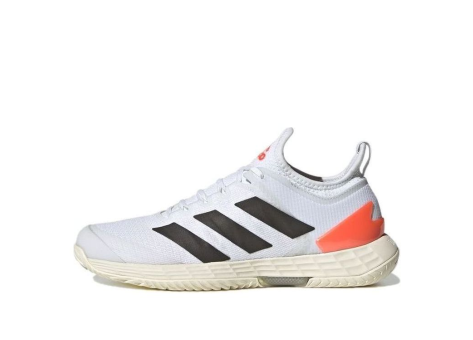Der adidas Originals Adizero Ubersonic 4 Tokyo ist ein leichter und schneller Tennisschuh, ideal für Highspeed-Aktionen auf dem Court. Das Obermaterial besteht aus stretchigem, gewirktem Primeweave, das einen sicheren Sitz auch bei intensiven Bewegungen garantiert. Die Lightstrike-Dämpfung sorgt für eine ausgezeichnete Stoßabsorption und unterstützt die Explosivität bei schnellen Richtungswechseln und Sprints. Dieses Modell wurde bei einem großen Sportereignis in Japan getragen, was seine Leistungsfähigkeit unterstreicht. Der Schuh ist speziell für Damen konzipiert und bietet dank seiner Konstruktion Stabilität, Komfort und optimale Performance beim Tennisspiel. Die Sohlen sind für guten Grip und Rutschfestigkeit auf Tennisplätzen ausgelegt. Das Design zeigt die typischen adidas-Streifen in Schwarz auf weißer Basis, mit einem auffälligen orangen Akzent an der Ferse, der für zusätzliche Sichtbarkeit sorgt.