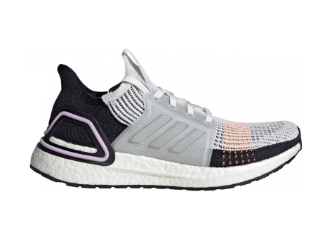 Der adidas Originals UltraBoost 19 ist ein Damen-Laufschuh, der mit einer modernen Low-Top-Silhouette und einem mehrfarbigen, gestrickten Obermaterial in Weiß, Schwarz und Akzenten in Orange und Grau überzeugt. Dieses Modell gehört zur UltraBoost-Serie von adidas und ist bekannt für seine exzellente Energierückgabe und Dämpfung beim Laufen. Die Zwischensohle ist mit der Boost-Technologie ausgestattet, die eine außergewöhnlich reaktionsfreudige und weiche Dämpfung bietet. Das Obermaterial besteht aus einem atmungsaktiven und elastischen Primeknit-Gewebe, das sich dem Fuß anpasst und gleichzeitig stabilen Halt ermöglicht. Durch die Fersenkappe wird der Fuß zusätzlich stabilisiert, was auch das Design optisch unterstützt. Die Außensohle bietet durch den Continental-Gummi guten Grip und Strapazierfähigkeit. Der Schuh ist ideal für sportliche Aktivitäten wie das Laufen, wobei er auch modisch im Alltag getragen werden kann. Die Kombination aus Komfort, Leistung und modernem Design macht den UltraBoost 19 zu einem beliebten Modell in der Laufschuh-Kategorie von adidas.