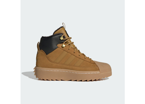 Der adidas Originals Superstar Winterized Trek ist eine wintertaugliche Version des klassischen Superstar Schuhs, der seit über 50 Jahren ein ikonischer Bestandteil des Streetstyles ist. Dieses Modell ist als Stiefel gestaltet, um auch bei kaltem Wetter getragen werden zu können. Das Obermaterial besteht aus Leder und Synthetik, ergänzt durch eine mit dem Obermaterial verbundene Zunge, die das Eindringen von Wasser verhindert und die Füße trocken hält. Das Innenfutter ist aus Textil gefertigt, was für zusätzlichen Komfort sorgt. Die Gummiaußensohle bietet besonders guten Halt auf verschneiten und rutschigen Straßen dank ihres griffigen Profils. Die Schuhe haben eine reguläre Passform und werden mit Schnürsenkeln geschlossen. Das Design zeigt sich in Braun mit schwarzen Akzenten und einer robusten, gezahnten Laufsohle, die sowohl funktional als auch modisch ist. Diese robuste, wasserabweisende Variante des klassischen Superstars eignet sich besonders gut für die Nutzung im Winter und verbindet dabei den unverwechselbaren Look mit praktischen Eigenschaften für kältere und nasse Bedingungen.