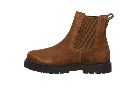 Der Birkenstock Highwood Slip On ist ein eleganter Chelsea-Boot in einem warmen, erdigen Braunton. Er besteht aus durchgehendem Veloursleder und besitzt elastische Seitenpartien sowie eine Zuglasche an der Ferse, die das An- und Ausziehen erleichtern. Die abgerundete Zehenpartie und die markante Nahtführung verleihen dem Schuh eine weiche, dennoch markante Optik. Die robuste, strukturierte Außensohle sorgt für eine langlebige und strapazierfähige Nutzung. Die schlanken und modernen Linien machen diesen Boot zu einem vielseitigen und stylischen Begleiter für zeitgenössische und anspruchsvolle Garderoben. Der Schuh verbindet klassische Chelsea-Boot-Elemente mit einer hochwertigen Verarbeitung und eignet sich hervorragend für den Alltag, insbesondere in der kalten Jahreszeit dank seiner Aufbauform und Materialwahl.