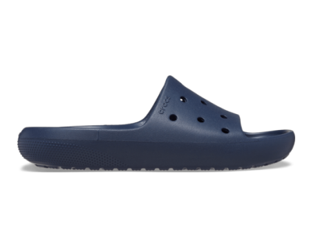 Die Crocs Classic Slide V2 sind Teil der neuen, optimierten Classic Sandals Kollektion von Crocs, die durch verbesserte Passform, Komfort und modernes Design überzeugt. Diese Sandalen sind vom klassischen Classic Clog inspiriert und bieten ein leichtes, flexibles und äußerst bequemes Trageerlebnis dank des Iconic Crocs Comfort™-Systems. Das tief geschlossene Fußbett aus Croslite™-Schaum sorgt für dauerhaften Komfort und eine angenehme Dämpfung, die das Gefühl von Leichtigkeit und Flexibilität unterstützt. Die Sandalen sind sehr leicht, einfach zu reinigen und schnelltrocknend, was sie besonders praktisch macht. Zudem bieten sie eine weite Passform, wobei empfohlen wird, eine halbe Nummer kleiner zu wählen. Das Design ist unifarben in Navy gehalten und zeichnet sich durch eine offene Kappe und Schlupfform aus. Mit den Löchern für Jibbitz™-Anstecker lassen sich die Sandalen individuell personalisieren und kreativ gestalten. Die Verarbeitung aus leichtem, widerstandsfähigem Material macht sie besonders langlebig und vielseitig einsetzbar, vor allem für Freizeit und entspannte Anlässe. Diese Sandalen sind ideal für alle, die Wert auf Komfort und Stil legen und dabei eine unkomplizierte, praktische Schuhwahl bevorzugen. Der Absatz ist flach gestaltet, wodurch die Slides einen entspannten, legeren Look bieten.