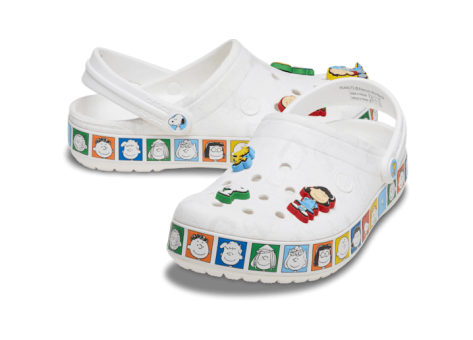Der Crocs Peanuts Crocband Clog besticht durch ein weißes Obermaterial mit einem dezenten Figuren-Print und bunten Portraits der Peanuts-Charaktere wie Peppermint Patty, Marcie und Franklin an der Sohle. Verziert wird das Modell durch sechs exklusive Jibbitz™-Anstecker, die berühmte Figuren wie Charlie Brown, Snoopy, Lucy, Linus, Sally und Woodstock darstellen. Die Schuhe sind einfach zu reinigen, schnelltrocknend, mit Belüftungslöchern für optimale Atmungsaktivität und aus ergonomisch geformtem Croslite™-Material gefertigt, das Leichtigkeit, Flexibilität und hohen Tragekomfort bietet. Ein kippbarer Fersenriemen sorgt für einen sicheren Sitz. Diese wasserfreundlichen und schwimmfähigen Slip-Ons bringen durch die verspielten Peanuts-Design-Elemente viel Farbe und Nostalgie in den Alltag und zeichnen sich durch den ikonischen Crocs Komfort aus, der eine flexible Polsterung und rundum angenehmes Tragegefühl garantiert.