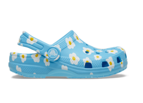 Der Crocs Toddler Classic Daisy Clog ist speziell für Kleinkinder entworfen und überzeugt durch seine stylishe Gänseblümchen-Grafik, die dem Schuh einen fröhlichen, verspielten Look verleiht. Hergestellt aus dem leichten und flexiblen Croslite™-Schaummaterial bietet der Schuh ein angenehmes Tragegefühl mit ikonischem Crocs Comfort™ – leicht, flexibel und rundum komfortabel. Der Schuh ist einfach zu reinigen und schnelltrocknend, was ihn besonders praktisch für den Alltag kleiner Kinder macht. Ein kippbarer Fersenriemen sorgt für einen sicheren Halt, während Jibbitz™-Anstecker die Möglichkeit bieten, den Schuh individuell und persönlich zu gestalten. Die robuste, leicht profilierte Sohle ermöglicht sicheren Stand und Halt, ideal für aktive Kinder, die Komfort und Spaß beim Tragen schätzen. Der Clog ist in einem hellblauen Farbton mit weißen und gelben Gänseblümchen gestaltet und bietet damit einen lebendigen, freundlichen Look.