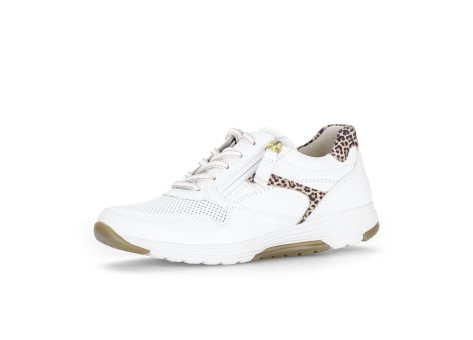 Der Gabor Komfortschuh 86.978 für Damen präsentiert sich in klassischem Weiß mit Akzenten in Leoprint am oberen Schaft und an der Seite. Der Schuh verfügt über eine strapazierfähige Sohle mit gutem Profil, die für Komfort bei längeren Gehstrecken sorgt. Das Obermaterial ist teilweise perforiert, was die Atmungsaktivität verbessert. Ein praktischer seitlicher Reißverschluss unterstützt das An- und Ausziehen, zusätzlich zu der Schnürung. Die Innensohle ist gepolstert und bietet angenehme Dämpfung, ideal für den Gebrauch im Alltag. Die Kombination aus modischem Design und funktionalem Komfort macht diesen Schuh zu einer guten Wahl für Damen, die Wert auf Bequemlichkeit und Stil legen. Größe 42 EU wird hier dargestellt. Die Marke Gabor ist bekannt für qualitätsorientierte Schuhe, die Komfort und Stil vereinen.