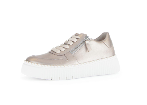 Der Gabor Satin Met. Damenschuh in Gold ist ein eleganter Sneaker mit einem auffälligen Metallic-Finish. Er hat eine weiße, leicht profilierte Plateausohle, die dem Schuh eine modische und trendige Optik verleiht. Die Kombination aus Satin-Material und metallischem Glanz macht diesen Schuh zu einem besonderen Blickfang. Die Schnürung ermöglicht eine individuelle Anpassung, während ein seitlicher Reißverschluss das An- und Ausziehen erleichtert. Das Modell ist in der Größe 41 EU erhältlich und eignet sich ideal für modebewusste Frauen, die Komfort und Stil verbinden möchten. Die Plateau-Sohle sorgt für zusätzlichen Komfort und hebt den Fuß optisch an. Insgesamt ist dies ein moderner Freizeitschuh, der sowohl im Alltag als auch bei besonderen Anlässen getragen werden kann.