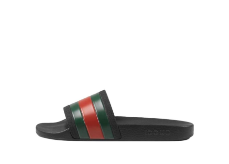 Die Gucci Pursuit 72 Rubber Slides sind elegante Slip-on Sandalen der italienischen Luxusmarke Gucci. Das Obermaterial besteht aus einem synthetischen Gummiriemen, der die charakteristischen rot-grünen Streifen von Gucci mit einer schwarzen Körnung umrahmt. Die Sandalen verfügen über ein dickeres, geformtes Fußbett aus Gummi, das am Absatz leicht erhöht ist und für ausreichend Dämpfung sorgt. Seitlich am Absatz ist das Gucci-Logo dezent in schwarz geprägt. Die Gummisohle besitzt ein Logo-profil, das Rutschfestigkeit und guten Halt gewährleistet. Das Modell hat eine runde Zehenform und eine flache Ferse, ideal für bequeme und lässige Looks. Diese modischen Slides sind perfekt für den Alltag und zeichnen sich durch ihren minimalistisch sportlichen Stil aus. Sie sind keine Sportschuhe, sondern klassische Fashion-Sandalen und eignen sich vor allem als unkomplizierte Sommerschuhe oder für den Urlaub. Das Design unterstreicht die hochwertige Verarbeitung und den Luxuscharakter von Gucci, ohne auf Komfort zu verzichten.
