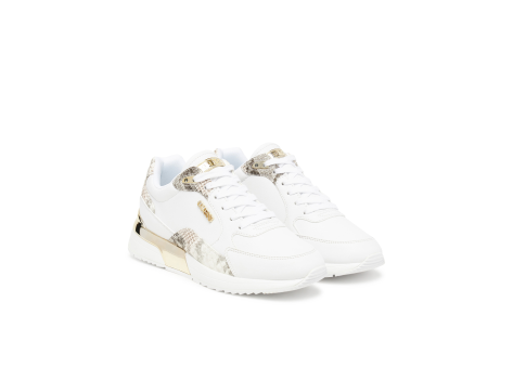 Der Guess Moxea ist ein modischer Damensneaker aus weißem Glattlederimitat mit Schnürverschluss. Er verfügt über eine runde Spitze und eine Absatzhöhe von 5,3 cm, wodurch er sportlich-elegant wirkt. Das Obermaterial besteht zu 100% aus Polyurethan (Kunstleder), während Innensohle und Innenfutter aus Polyester gefertigt sind. Die Sohle besteht aus Gummi. Das Design ist geprägt von Tiermustern und irisierenden Einsätzen, die dem Schuh einen auffälligen Look verleihen. Das Logo der Marke Guess ist an mehreren Stellen sichtbar, darunter an der Vorderseite, seitlich, hinten sowie auf der Sohle. Ein weiteres Detail ist das textile Wechselfußbett, das zusätzlichen Komfort bietet. Diese Sneaker verbinden sportlichen Stil mit auffälligen Designelementen und eignen sich gut als modischer Begleiter im Alltag.