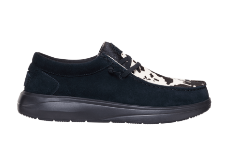 Der Hey Dude Wally COMF Cow ist ein auffälliger Slip-On-Schuh mit einem schwarz-weißen Kuhmuster am Polsterkragen und einer schwarzen Basis. Er kombiniert stilvolles Design mit praktischem Komfort. Das Obermaterial wurde mit einem wasserabweisenden Spray behandelt, was den Schuh widerstandsfähiger gegen Feuchtigkeit macht. Die elastischen Schnürsenkel ermöglichen ein einfaches An- und Ausziehen. Zunge, Kragen und Fersenkappe sind gepolstert, was den Tragekomfort zusätzlich erhöht. Besonders angenehm ist die erhöhte, herausnehmbare Komfort-Einlegesohle aus Schaumstoff, die für weiche und geschmeidige Schritte sorgt. Dieser Schuh ist ideal sowohl für entspannte Tage zu Hause als auch für Outdoor-Abenteuer oder Reisen geeignet. Der Wally COMF Cow punktet durch Flexibilität, Leichtigkeit und modisches Auftreten, was ihn zu einem vielseitigen Begleiter im Alltag macht.
