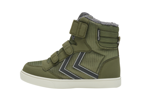 Der HUMMEL STADIL SUPER Mid ist ein Kinderstiefel mit einem atmungsaktiven und reflektierenden hummelTEX-Obermaterial, das für Frische und Sichtbarkeit sorgt. Er besitzt eine Cupsole-Konstruktion, die hervorragende Stabilität bietet. Der Schuh verfügt über abschneidbare VELCRO-Klettriemen und einen hohen Schaft am Knöchel, der den Fuß sicher hält. Der Schuh hat eine normale bis weite Breite und wird mit einem Wachstumsspielraum von 1–1,5 cm empfohlen. Im Inneren ist der Schuh mit einem wärmenden Futter ausgestattet, was ihn besonders für die kalte Jahreszeit geeignet macht. Die Farbkombination ist überwiegend olivgrün mit grauen Akzenten und einer weißen Sohle. Der Schuh ist nachhaltig gefertigt, da der Name "Superpoly Recycled" auf die Verwendung recycelter Materialien hinweist. Es handelt sich um einen robusten, bequemen Schuh für Kinder, der sich durch seine Stabilität und den Schutz des Knöchels auszeichnet und sich ideal für den Winter eignet.
