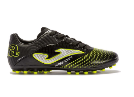 Der Joma Xpander Ag ist ein Fußballschuh für Erwachsene, der klassisch geschnitten ist und aus widerstandsfähigen, modernen Materialien gefertigt wurde. Das Obermaterial besteht aus hochwertigem Mikro-Polyurethan (Mikro-PU) mit hoher Reißfestigkeit und ist innen mit textilem Material ausgestattet, um den Tragekomfort zu erhöhen. Die Schuhe verfügen über eine EXO COUNTER-Außenstütze, die speziell die Ferse schützt und Stabilität bietet. Die Innensohle besteht aus EVA, während die Einlegesohle aus Volltexonmaterial und PVC gefertigt ist und bis zum mittleren Bereich reicht, um die Stollenstruktur sicher zu halten. Die Sohle ist aus hochwertigem, synthetischem Material gefertigt und zeichnet sich durch hohe Verschleißfestigkeit aus, was insgesamt zu einer sehr langlebigen Konstruktion beiträgt. Das Design ist sportlich und funktional, ideal für den Einsatz auf dem Fußballplatz auf Kunstrasen oder Hartplätzen. Die Schuhfarbe in der Abbildung ist überwiegend schwarz mit gelben und weißen Akzenten. Die Kombination aus Schutz, Komfort und Langlebigkeit macht den Joma Xpander Ag zu einem hochwertigen Fußballschuh für ambitionierte Spieler.