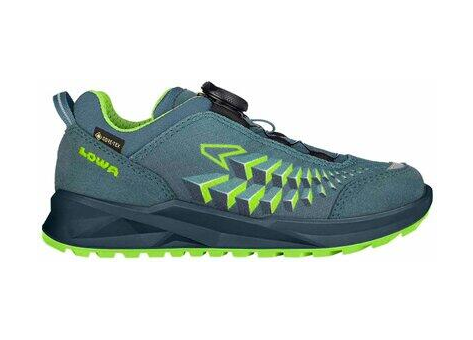 Der Lowa Ferrox GTX LO Kinderschuh bietet dank des innovativen TURN-TO-TIGHTEN-Schnürsystems mit Drehverschluss ein einfaches und schnelles An- und Ausziehen. Das Modell ist speziell auf Kinderfüße abgestimmt und überzeugt durch einen kindgerechten Leistenschnitt, eine gut gedämpfte LOWA-DynaPU®-Zwischensohle sowie einen stabilisierenden Support Frame, der für hohen Tragekomfort und Unterstützung sorgt. Das Design besticht durch coole Digitalprints, die optisch ansprechend wirken. Die Laufsohle Lowa® Urban Trail Junior ist optimal für den urbanen und leichten Geländeeinsatz gestaltet. Sie besitzt breite Profilkanäle, die Flüssigkeit und Schmutz effektiv ableiten, und gewährleistet ein harmonisches Abrollverhalten. Mit einem Paargewicht von 760 Gramm und einer normalen Leistenweite ist der Schuh ideal für Kinder, die in der Stadt oder auf leichten Trails aktiv sind. Die Zwischensohle aus PU sorgt für angenehme Dämpfung, während das verwendete Gore-Tex-Material die Atmungsaktivität und Wasserdichtigkeit verbessert. Somit ist der Ferrox GTX LO Junior sowohl funktional als auch komfortabel und praktisch im Alltag einsetzbar.