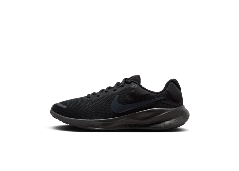 Der Nike Revolution 7 ist ein Herren-Laufschuh, der speziell für das Laufen auf der Straße entwickelt wurde. Er bietet eine weiche, schaumstoffbasierte Mittelsohle, die ein angenehmes, geschmeidiges Laufgefühl vermittelt. Im Vergleich zum Vorgängermodell Revolution 6 wurde der Vorfußbereich verbreitert, um den Zehen mehr Platz zu bieten und dadurch den Tragekomfort zu erhöhen. An der Ferse befinden sich sichtbare Polster, die sich weich anfühlen und den Bereich um die Achillessehne besonders komfortabel machen. Die Schuhzunge ist mit Berührungspunkten ausgestattet, welche ein natürliches Abrollen beim Laufen unterstützen. Die Außensohle besitzt ein generatives Traktionsmuster mit Gummistollen, die Grip bei Bergauf- und Bergabläufen sichern. Das Design ist stilvoll und die Schuhe bieten eine Kombination aus Komfort und Leistungsfähigkeit für den Einsatz auf der Straße. Die Farbe des abgebildeten Modells ist schwarz mit schwarzen Details, passend für sportliche und alltagsnahe Looks.