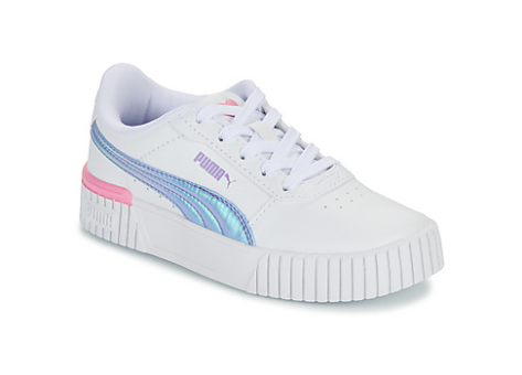 Der PUMA Carina 2.0 Bouncy Sky PS ist ein Mädchensneaker, inspiriert von den Stilen der 80er Jahre und verbindet eine klassische Tennissilhouette mit einem modernen, entspannten Sneaker-Look. Dieses Modell bezieht sich auf den lässigen Stil kalifornischer Strandstädte und bewahrt das vertraute Design der Originalsneaker, wurde jedoch mit aktuellen Designelementen, wie breiteren vertikalen Linien und einem PUMA-Logo auf der Ferse, aufgefrischt. Ein besonderer Fokus liegt auf den holografischen Materialien, die Lichtspiele ähnlich Seifenblasen einfangen und dem Schuh eine einzigartige Optik verleihen. Gepolsterte Komponenten sorgen für ein angenehmes Tragegefühl, während geprägte Details dem Sneaker einen modernen Touch verleihen. Die Materialauswahl umfasst Leder und sonstige Materialien für das Obermaterial sowie Textil für Futter und Decksohle. Zudem ist der Schuh aus recycelten Materialien gefertigt, was ihn umweltbewusster macht. Die Laufsohle besteht aus einem sonstigen Material, das typische Eigenschaften für einen Freizeitschuh bietet. Insgesamt ist dieser Sneaker ein stylishes, komfortables und nachhaltiges Modell, das sich ideal für den Alltag und modebewusste junge Trägerinnen eignet.
