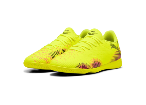 Der PUMA Future 8 Play IT ist ein dynamischer Hallenfußballschuh, der für Indoor-Training und Matches entwickelt wurde. Das Obermaterial besteht aus leichtem, strapazierfähigem synthetischen Material mit mindestens 20 % recyceltem Anteil und besitzt eine LYCRA®-Slip-on-Zunge, die für Komfort, optimalen Halt und Strapazierfähigkeit sorgt. Geprägte Linien im Vorfußbereich verbessern die Ballkontrolle und bieten zusätzlichen Grip, was Spielern hilft, Verteidiger mühelos auszumanövrieren. Die flache, nicht abfärbende Gummi-Außensohle ist speziell für den Hallenboden konzipiert, bietet exzellente Traktion und Stabilität bei schnellen Bewegungen. Die Passform ist von regulär bis breit, was einen angenehmen Sitz gewährleistet. Das auffällige gelbe Design mit kontrastierenden Linien verleiht dem Schuh einen modernen und sportlichen Look, der den Puma-Stil neu definiert. Insgesamt vereint der Schuh Funktionalität, Performance und Nachhaltigkeit in einem modernen Design, ideal für Spieler, die Kreativität und Präzision auf dem Spielfeld entfalten möchten.