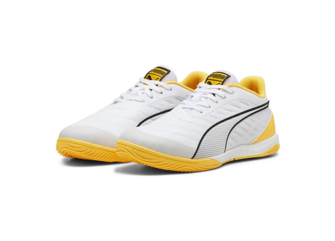 Der PUMA Ibero IV ist ein leichter, hochleistungsfähiger Futsal-Schuh, der speziell entwickelt wurde, um die Anforderungen auf dem Spielfeld zu erfüllen. Das Obermaterial besteht aus besonders weichem Kunstleder im Vorderfußbereich, was den Ballkontakt und die Ballkontrolle deutlich verbessert. Der Schuh verfügt über eine SPEEDCAGE im Mittelfußbereich für bessere Atmungsaktivität und erhöhten Komfort während des Spiels. Die Zwischensohle aus vollem EVA-Schaummaterial sorgt für eine verbesserte Dämpfung bei schnellen Bewegungen und abrupten Richtungswechseln. Die Laufsohle ist flach und aus nicht markierendem Gummi gefertigt, ideal für den Hallensport. Der Schuh bietet eine perfekte Kombination aus Strapazierfähigkeit und Komfort und ist somit optimal für ernsthafte Futsal-Spieler geeignet. Der Schuh hat eine sportliche, niedrige Silhouette und ist in einem modernen Design mit weißem und gelbem Farbschema gehalten. Die Marke PUMA steht für Qualität und Performance im Sportbereich.