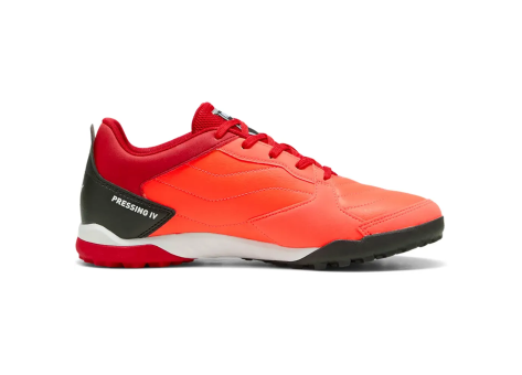 Der PUMA Pressing IV Tf ist ein Performance-Sportschuh, der speziell für den Einsatz auf harten Naturrasenflächen und Kunstrasen (2G) konzipiert wurde. Das Obermaterial besteht aus mehreren Materialschichten, die im Design integriert sind, um maximalen Schutz und Langlebigkeit zu gewährleisten. Besonders weich ist das verwendete Kunstleder, das Komfort und Strapazierfähigkeit verbindet. Die Mittelsohle ist aus weichem EVA-Schaummaterial gefertigt, das eine optimale Dämpfung bietet und somit den Tragekomfort erhöht. Die Außensohle ist flach und mehrfach profiliert, um guten Halt und Stabilität auf den genannten Untergründen zu gewährleisten. Dieses Modell ist ein robuster und zugleich bequemer Fußballschuh, der besonders für das Training und Spiel auf Kunstrasenflächen geeignet ist. Die klare Linienführung und die Farbkombination aus Rot und Schwarz verleihen dem Schuh ein sportliches und modernes Design. Der Schuh ist ein Produkt der Marke PUMA.