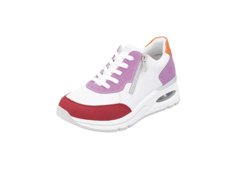 Der Remonte Keilsneaker D2H00-82 überzeugt durch sein modisches und gleichzeitig komfortables Design. Er verfügt über eine Extraweite, die besonders viel Platz und Komfort für breitere Füße bietet. Das Obermaterial besteht aus echtem Leder, was Langlebigkeit und eine hochwertige Optik garantiert. Die Einlegesohle ist auswechselbar, was eine individuelle Anpassung und längere Nutzungsdauer ermöglicht. Das Modell ist mit der Lite n Soft Technologie ausgestattet, die für ein angenehmes Tragegefühl durch eine leichte und weiche Sohle sorgt. Optisch besticht der Sneaker durch die Kombination von Weiß, Rot, Lila und Orange, die ihm einen frischen und sportlichen Look verleihen. Ein zusätzlicher Reißverschluss an der Seite erleichtert das An- und Ausziehen. Insgesamt ist dieser Schuh ein idealer Begleiter für den Alltag, der sowohl durch Funktionalität als auch durch ansprechendes Design überzeugt.