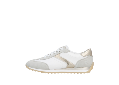 Der Remonte D3H03 ist ein sportlicher Schnürer für Damen, hier in der Farbe Weiß und in der Größe 43 EU. Der Schuh kombiniert verschiedene Materialien in Weiß- und Grautönen mit einem metallicfarbenen Akzent, was ihm einen modernen und sportlich-eleganten Look verleiht. Die Sohle ist in einem hellen Beige gehalten und bietet guten Halt. Der Schnürverschluss sorgt für eine individuelle Anpassung des Schuhs. Dieses Modell eignet sich gut für den Alltag und lässt sich vielseitig kombinieren. Die Marke Remonte steht für bequeme und modische Schuhe, die sowohl Komfort als auch Stil vereinen.