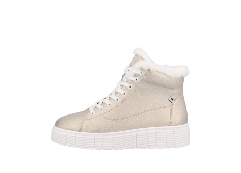 Der Rieker Schnürstiefel W1071-90 ist ein Damenschuh in Gold mit einem modischen und sportlichen Design. Der Schuh verfügt über eine mittelhohe Silhouette mit einem robusten und strukturierten Profil auf der weißen Laufsohle. Die Schnürung ermöglicht eine individuelle Anpassung des Sitzes. Das Innenfutter besteht aus einem weichen, flauschigen Material, was den Schuh besonders angenehm und warm macht, ideal für die kühleren Tage. Der Stil verbindet Komfort mit trendigem Aussehen, was ihn vielseitig für den Alltag und Freizeitaktivitäten macht. Die Marke Rieker ist bekannt für Qualität und Bequemlichkeit in ihren Schuhen, was sich auch hier widerspiegelt.