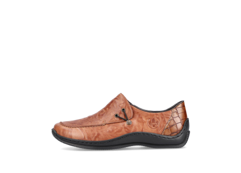 Der Rieker Slipper Trotteur L1750-22 ist ein komfortabler Schuh, der speziell für einfaches Anziehen konzipiert wurde. Die elastische Ausstattung im Einstiegsbereich ermöglicht, den Schuh ohne Bücken anzuziehen und sorgt für eine optimale Passform. Das Obermaterial besteht aus weichem, braunem, glattem Leder, das dem Schuh ein elegantes und zeitloses Aussehen verleiht. Das Innenfutter kombiniert Kunstleder und Textil, was für angenehmen Tragekomfort sorgt. Die Lederdecksohle bietet zusätzlich ein weiches Laufgefühl und ist Teil der Rieker Antistress-Technologie, die für ein entspanntes Lauferlebnis bekannt ist. Die Laufsohle besteht aus Synthetik und garantiert eine gute Strapazierfähigkeit. Dieses Modell eignet sich damit hervorragend als bequemer Alltagsschuh, der sowohl Stil als auch Komfort vereint.