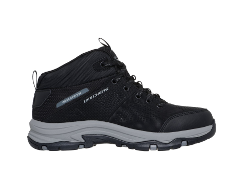 Der Skechers Relaxed Fit Trego Trail Destination ist ein halbhoher Wanderschuh, der speziell für Outdoor-Abenteuer abseits der ausgetretenen Pfade entwickelt wurde. Das Obermaterial besteht aus strukturiertem Mesh kombiniert mit robusten Synthetik-Overlays, die für Stabilität und Atmungsaktivität sorgen. Dieser Schuh ist vollständig wasserdicht, was ihn ideal für feuchte und anspruchsvolle Bedingungen macht. Die Innensohle verfügt über die Skechers Air-Cooled Memory Foam-Technologie, die für langanhaltenden Tragekomfort und gute Dämpfung sorgt. Die Sohle ist profilreich gestaltet, um auf verschiedenen Untergründen guten Halt zu bieten. Die Farbe des Schuhs ist Schwarz mit grauen Akzenten. Durch seine Konstruktion bietet der Schuh eine entspannte Passform, die Bewegungsfreiheit erlaubt und zugleich festen Halt gewährleistet. Besonders geeignet ist dieser Schuh für Wanderungen und Aktivitäten in unwegsamem Gelände, wobei die Wasserdichtigkeit und die stoßdämpfenden Eigenschaften für ein angenehmes Trageerlebnis sorgen. Skechers ist als Marke bekannt für komfortable und funktionale Schuhe, was hier erneut zum Tragen kommt.