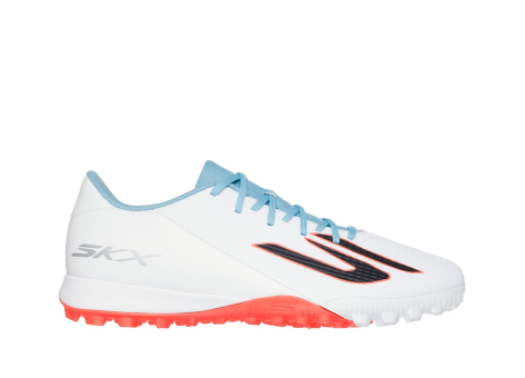 Der Skechers SKX 2 Academy TF ist ein leichter Turf-Soccer-Schuh, der speziell für den Einsatz auf Kunstrasenplätzen konzipiert wurde. Das Obermaterial ist weich und so gestaltet, dass es maximale Ballkontrolle ermöglicht. Die Sohle ist aus responsivem, profiliertem Gummi gefertigt, was eine multidirektionale Griffigkeit und Beweglichkeit unterstützt. Für zusätzlichen Komfort sorgt die Skechers Move Foam™ Dämpfung, die ein angenehmes Laufgefühl auf dem Spielfeld bietet. Das Design ist modern und sportlich, mit einer Farbkombination aus Weiß und Türkis sowie roten Akzenten an der Sohle. Der Schuh ist ideal für Fußballspieler, die auf Kunstrasen optimale Leistung und Komfort suchen.