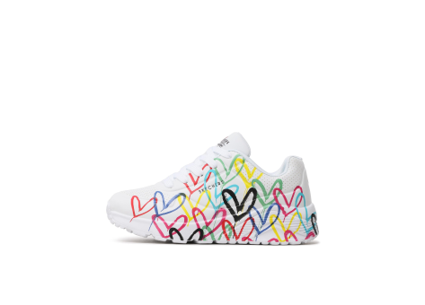 Der Skechers UNO SPREAD THE LOVE Kindersneaker besticht durch ein weißes Kunstleder-Obermaterial, das mit einem bunten Herz-Print verziert ist. Dieses auffällige Design ist in Zusammenarbeit mit dem international bekannten Wandmaler James Goldcrown entstanden. Der Schaft ist angenehm gepolstert, und die Schnürung ermöglicht eine optimale Anpassung an den Fuß. Die Air Cooled Memory Foam Einlegesohle passt sich schnell der Fußform an und sorgt für hohen Tragekomfort. Für zusätzliche Dämpfung und Komfort sorgt die in die Laufsohle integrierte Skech Air Luftkissen-Zwischensohle. Ein besonderes Highlight des Sneakers ist die Maschinenwaschbarkeit, die eine einfache Reinigung ermöglicht. Dieses Modell eignet sich ideal für Kinder, die Wert auf komfortable, modische und pflegeleichte Schuhe legen.