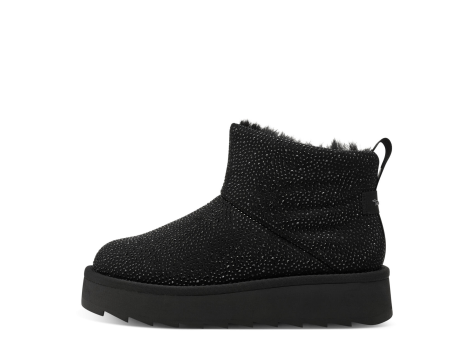 Die Tamaris Klassische Stiefelette für Damen präsentiert sich in elegantem Schwarz und kommt in der EU-Größe 37. Das Obermaterial besticht durch eine samtige Textur, die mit feinen Glitzerakzenten verziert ist, was der Stiefelette einen modischen und charmanten Look verleiht. Sie verfügt über eine moderate Plateau-Sohle in Schwarz, die nicht nur stylisch, sondern auch komfortabel ist und guten Halt bietet. Die Stiefelette hat eine kurze Schaftlänge, die gut mit verschiedenen Outfits kombinierbar ist und sich besonders für herbstliche und winterliche Tage eignet. Die Innenseite scheint leicht gefüttert zu sein, was zusätzlichen Tragekomfort bietet. Mit ihrer vielseitigen schwarzen Farbgebung und dem zeitlosen Design ist diese Stiefelette ein idealer Begleiter für den Alltag und besondere Anlässe. Die Marke Tamaris steht dabei für Qualität, modische Designs und Komfort.