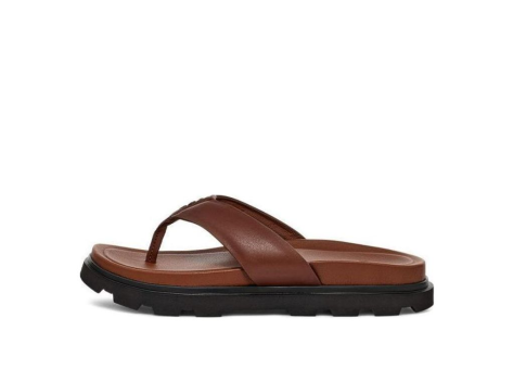 Die UGG Capitola Flip Sandalen sind hochwertige Flip-Flops aus robustem Leder, ideal für den Sommer. Das Obermaterial besteht aus strapazierfähigem Leder, das für Langlebigkeit sorgt. Für ein angenehmes Tragegefühl sind die Sandalen mit einer Polsterung und einem Lederfutter ausgestattet. Die Zwischensohle ist ebenfalls mit Leder ausgekleidet, was den Komfort verbessert. Die EVA SugarSole™ Laufsohle gewährleistet eine weiche und mühelose Dämpfung beim Gehen. Das thermogeprägte UGG®-Logo auf den Sandalen verleiht dem Modell einen markanten und stylischen Akzent. Diese Sandalen kombinieren Komfort mit stilvollem Design und sind perfekt für entspannte Sommertage geeignet.