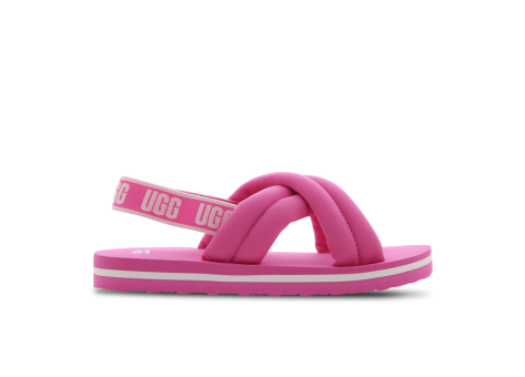 Die UGG Everlee Sandalen sind leichte, stylische Hausschuhe mit einem robusten Nylon-Obermaterial, das Komfort und Haltbarkeit vereint. Die gekreuzten Riemen oben sorgen für eine bequeme Passform, während der elastische Fersenriemen für sicheren Sitz sorgt. Das Fußbett besteht aus weichem EVA-Schaum, der angenehme Dämpfung bietet und die Füße gut unterstützt. Die EVA-Mittelsohle und Außensohle sind strapazierfähig und verleihen eine gute Traktion und Grip bei jedem Schritt. Die runde Zehenform und die flache Absatzhöhe machen die Sandalen ideal für entspannte Stunden nach der Schule oder zu Hause. Das auffällige pinkfarbene Design mit dem „UGG“ Logo am Fersenriemen bietet modischen Look und Komfort zugleich. Die UGG Everlee Slides sind durch ihr elastisches und gut dämpfendes Material eine tolle Wahl für lockere Freizeitaktivitäten oder als bequeme Hausschuhe, die durch ihr cooles Design auch optisch überzeugen.