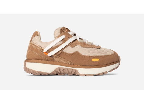 Der UGG RetroFi Low Chestnut ist ein Damen-Sneaker, der Stil und Komfort in einem klassischen Design vereint. Das Obermaterial besteht aus einer Kombination von echtem Veloursleder und recycelten Textilien, ergänzt durch textile Einsätze in Mesh-Optik. Der Sneaker überzeugt durch eine gepolsterte, doppellagige Zunge, einen gepolsterten Schaftrand und eine hochgezogene Hinterkappe für zusätzlichen Halt und Tragekomfort. Die Schnürung mit seitlicher Schlaufe sorgt für eine sichere Passform. Die Innensohle ist gepolstert, herausnehmbar und besteht aus geformtem Schaumstoff aus recycelten Materialien. Für Dämpfung und Rückfederung sorgt die reaktionsfähige EVA-Zwischensohle, die aus Zuckerrohr hergestellt ist. Die breite, partiell strukturierte Außensohle aus Gummi ist rutschhemmend und flexibel, mit Rillen für ein sicheres Laufgefühl. Ein TPU-Stabilisator an der Ferse unterstützt die Stabilität. Das Design wird durch dekorative Perforierungen an der Zunge, das Sonnenlogo auf dem Profil und ein Label-Badge an der Zunge abgerundet. Der Sneaker ist vielseitig einsetzbar und kombiniert Nachhaltigkeit durch Nutzung recycelter Materialien mit klassischem UGG-Stil, ideal für modebewusste Damen, die Wert auf Komfort und Langlebigkeit legen.