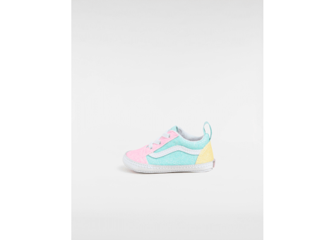 Der Vans Old Skool Crib ist ein Babyschuh, der speziell für die Kleinsten entworfen wurde. Er besticht durch das ikonische Vans-Design mit dem charakteristischen Sidestripe. Die elastischen Schnürsenkel und Fersenlaschen machen das An- und Ausziehen besonders einfach und praktisch für Eltern und Kinder. Die Laufsohle ist mit einem Print versehen, der die berühmte Vans Waffelsohle imitiert, was den klassischen Look vervollständigt. Ein roter Fersenbesatz setzt einen farblichen Akzent, der dem Schuh zusätzlich Stil verleiht. Die Farbkombination aus Rosa, Hellblau und Gelb sorgt für eine freundliche und verspielte Optik, ideal für Babys. Der Schuh eignet sich hervorragend für den Alltag und bietet einen hohen Tragekomfort dank des durchdachten Designs. Marke: Vans.