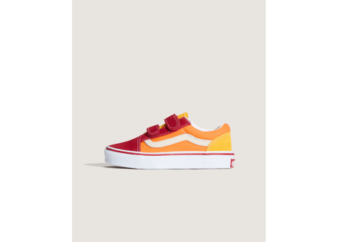 Der Vans Old Skool V für Kinder ist eine Neuinterpretation des ikonischen Sidestripe-Schuhs von Vans, gestaltet speziell für eine kinderfreundliche Passform. Anstelle der traditionellen Schnürsenkel verfügt dieser Low-Top-Schuh über doppelte Klettverschlüsse, die ein einfaches An- und Ausziehen ermöglichen. Das Obermaterial besteht aus robustem Wildleder, was dem Schuh Langlebigkeit und einen zeitlosen Charme verleiht. Die sonnige Farbgebung kombiniert Rot, Orange und Gelb, wodurch der klassische Sidestripe-Look einen frischen Retro-Stil erhält. Der Schuh ist bequem und bietet eine sichere Passform, die für ganztägigen Tragekomfort sorgt. Er eignet sich ideal für Kinder, die sich den ganzen Tag über aktiv bewegen und dabei stylisch unterwegs sein wollen. Die weiße Sohle rundet das Design ab und unterstreicht den sportlichen Charakter dieses Klassikers von Vans.