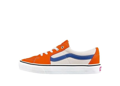 Der Vans SK8 Low ist ein klassischer Sneaker in Orange und Weiß mit charakteristischer blauer Seitenlinie, die das markante Vans Design repräsentiert. Der Schuh verfügt über eine niedrige Silhouette, wodurch er besonders bequem und vielseitig im Alltag einsetzbar ist. Die robuste Gummisohle sorgt für gute Griffigkeit und Langlebigkeit, ideal für Skater, aber auch für alle, die einen modischen Streetwear-Look bevorzugen. Das Obermaterial kombiniert strapazierfähige Textil- und Synthetikstoffe, die einem aktiven Gebrauch standhalten. Der Schuh ist mit einer gepolsterten Innensohle ausgestattet, die Komfort und Unterstützung bei längerem Tragen gewährleistet. Vans steht mit diesem Modell für einen zeitlosen und angesagten Sneaker, der sich leicht mit verschiedenen Outfits kombinieren lässt. Er eignet sich für den Alltag, sportliche Aktivitäten wie Skateboarding und ist ein typisches Beispiel für lässige, urbane Schuhmode.