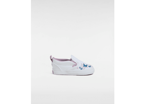 Der Vans Slip-On für Kleinkinder wurde speziell überarbeitet, um kleinen Füßen eine verbesserte Passform zu bieten. Dieser kultige Slip-On-Schuh ist mit seitlichen Klettverschlüssen ausgestattet, die das An- und Ausziehen erleichtern. Das Low-Top-Modell verfügt über ein Obermaterial aus Canvas, das mit Schmetterlingsstickerei und Applikationen verziert ist. Der Schuh hat einen stützenden, gepolsterten Rand und elastische Seiteneinsätze für zusätzlichen Komfort. Die Gummilaufsohle zeigt die charakteristische Waffel-Optik von Vans, die für guten Halt sorgt. Dies macht den Schuh zu einem unverzichtbaren Styling-Element für den Alltag von Kleinkindern. Er ist in der Größe 19 erhältlich und verbindet Funktionalität mit einem kindgerechten Design.