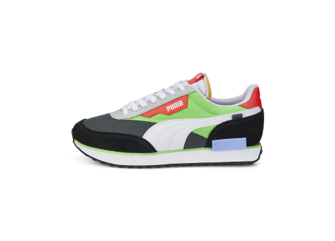 O PUMA Future Rider Play On é um tênis de corte baixo que reinterpreta o clássico modelo Rider, sendo especialmente adequado para uso urbano. O cabedal é feito de uma combinação de nylon superleve, camurça e couro liso, proporcionando conforto e respirabilidade. A entressola de EVA oferece amortecimento e contribui para o conforto durante o uso prolongado. A sola externa distintiva da PUMA, com design de amortecedor, absorve os impactos de forma eficaz e proporciona uma sensação agradável ao caminhar ou correr. O calçado apresenta o design característico da PUMA, com a famosa faixa lateral e outros elementos de marca que realçam o visual esportivo. A combinação de cores combina tons de cinza escuro com um verde fluorescente vibrante e um detalhe vermelho na área do calcanhar, tornando o calçado um destaque. O Future Rider Play On combina elementos clássicos de tênis com tecnologia moderna e é ideal para atividades de lazer esportivas e looks casuais.